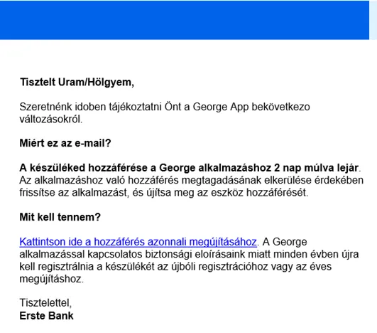 A csalók egy már jól ismert módszerrel, az adathalász e-mailek segítségével próbálják megtéveszteni a banki ügyfeleket. Az Erste Bank nevében küldenek e-mailt arra hivatkozva, hogy a George App le fog járni és egy linken keresztül újra kell regisztrálni a szolgáltatást.