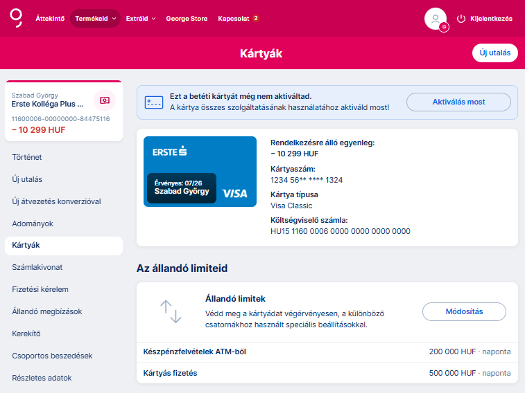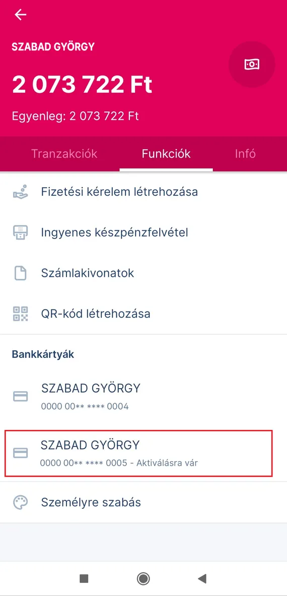 Funkciók menüpontban láthatod, hogy inaktív a kártyád. Kattints a „A kártya aktiválása” gombra.