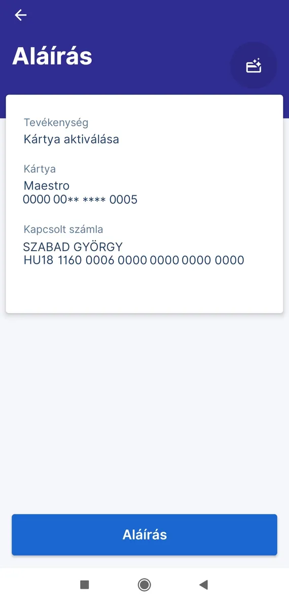 Aláírás oldalon válaszd az „Aláírás” gombot. Sikeres hitelesítés után néhány pillanat múlva már aktív is a kártyád: