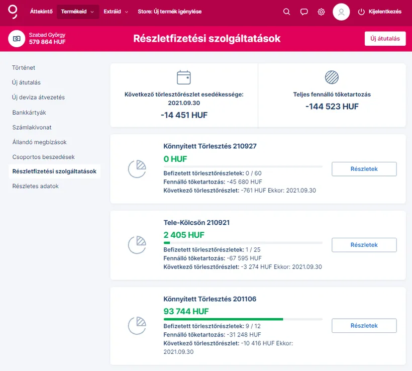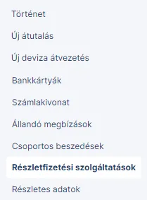 Kattints „A termékeid” menüpontra, majd válaszd ki azt a számlát, amin be van állítva a részletfizetés. Baloldalon megjelennek a választható tranzakciók, kattints a „Részletfizetési szolgáltatásokra”: