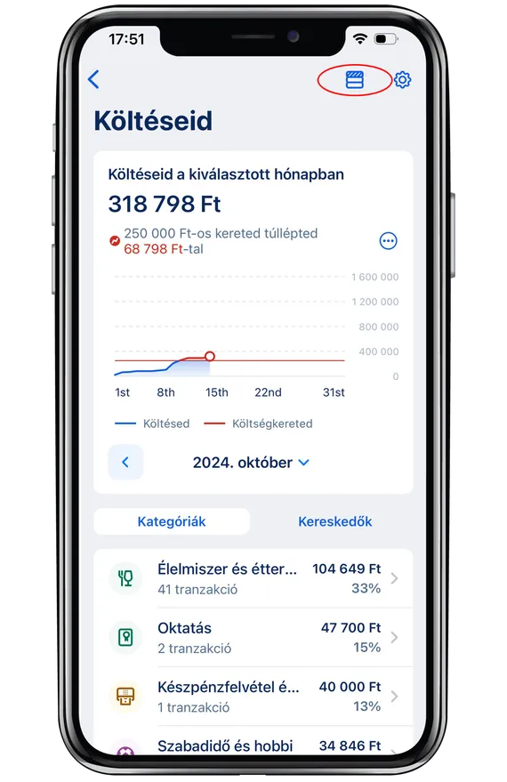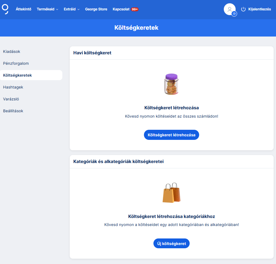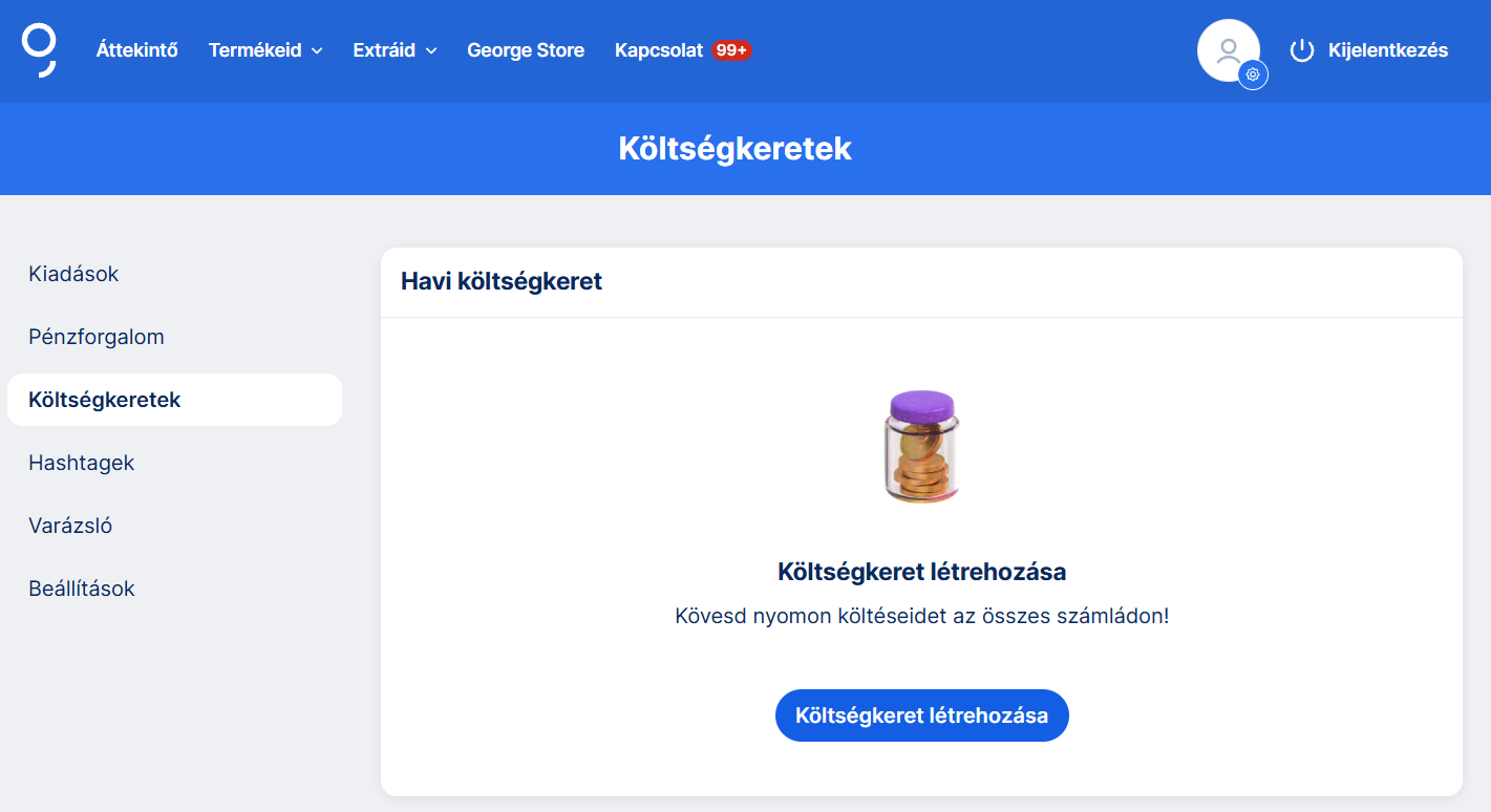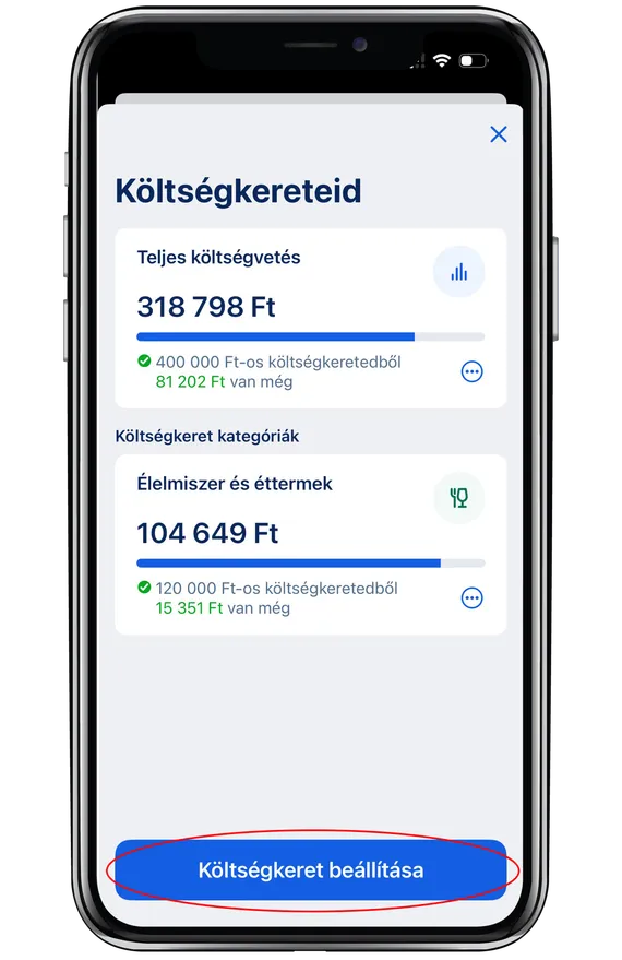 A „Költségkereteid” menüpontban beállíthatsz egy tetszőleges összeget – az adott havi költéseid ehhez az összeghez viszonyítva jelennek meg.