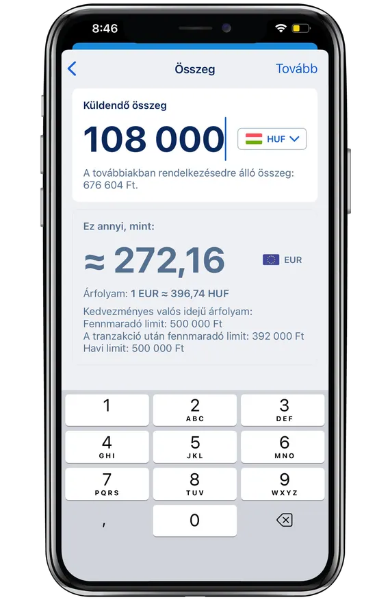 A tranzakció összegét az Összeg oldalon tudod megadni. A rendelkezésre álló összegnél van lehetőséged ellenőrizni a számla jelenlegi egyenlegét, illetve a fennmaradó havi kereted összegét is. A konverziós devizaátvezetések részleteit a Lakossági bankszámla és betéti kamat hirdetmény 1.1-es „A pénzforgalommal kapcsolatos általános szabályok”, illetve a 2.4. „Deviza konverzió saját számlák között” pontjában találod.