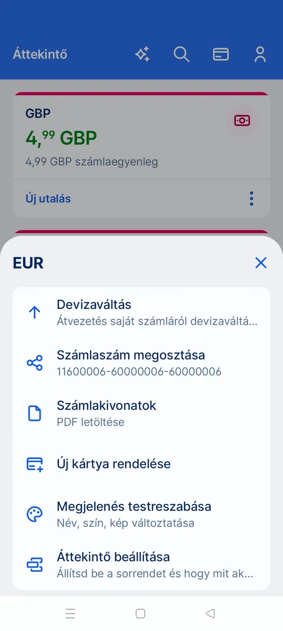 Átvezetést több módon is kezdeményezhetsz. Válaszd ki az „Áttekintő” oldalon a számla csempén megjelenő pontokat és válaszd a Devizaváltás lehetőséget.