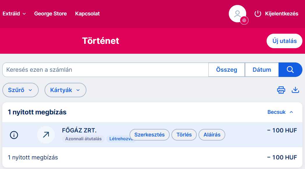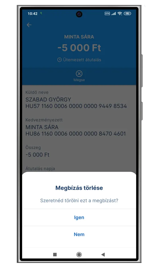 Megbízást törölni, csak ütemezett utalásoknál van lehetőség, egyéb megbízásoknál nem lehetséges. Ütemezett megbízás törléséhez érintsd meg az adott számlaterméket az Áttekintő oldalon, majd az így megjelenő „Tranzakciók” oldalon bökj a „Megbízások, Zárolások és Fizetési kérelmek” sávra. Következő oldalon Ütemezett megbízásként fogod megtalálni azokat a tételeket, melyeket egy későbbi átutalási dátumra rögzítettél. Érintsd meg az a tranzakciót, amit szeretnél visszavonni, majd az összeg alatt válaszd a Mégse lehetőséget.