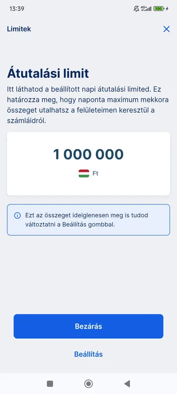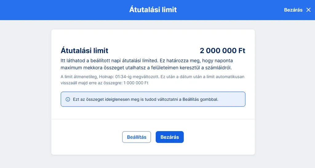 A következő oldalon láthatod a beállított napi átutalási limited. Ha időzáras limitbeállítást kértél, akkor azt is itt láthatod.