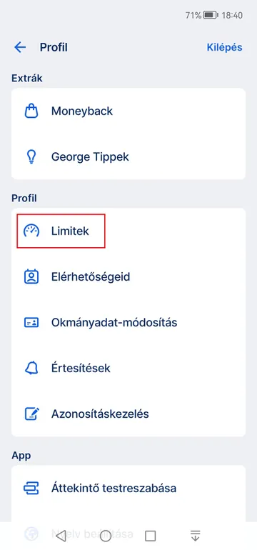 Koppints a Profilod menüpontra, és máris láthatod a Limitek funkciót. Ha szeretnéd ellenőrizni a beállított utalási limited, akkor itt megteheted.