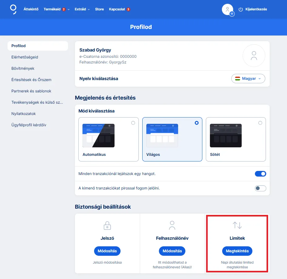 Kattints a Profilod menüpontra, majd itt a Biztonsági beállításoknál láthatod a Limitek funkciót. Ha szeretnéd ellenőrizni a beállított utalási limited kattints a Megtekintés gombra.