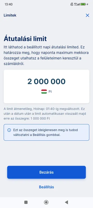 A következő oldalon láthatod a beállított napi átutalási limited. Ha időzáras limitbeállítást kértél, azt is itt láthatod.