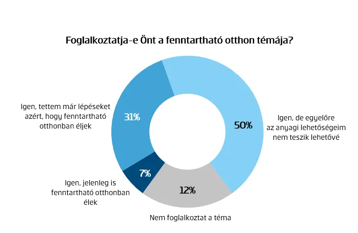 A válaszadók 66 százaléka tartja fontosnak (egy 0-10-ig terjedő skálán 8-10-re értékelve), hogy otthonában megújuló energiát vegyen igénybe: például napelemet, napkollektort, hőszivattyút. Az Erste Bank kérdőívére választ adók 36 százaléka nyilatkozott úgy, hogy már használ is valamilyen megújuló energiára alapozó megoldást, míg további 28 százalék nyitott lenne erre, de pénze egyelőre nincs erre a célra.