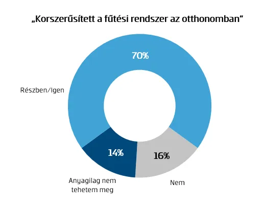 A fűtési rendszer korszerűsítését a válaszadók 84 százalék gondolja lényegesnek, így nem meglepő, hogy 70 százalék nyilatkozott úgy, hogy részben vagy teljesen modernizálta a fűtést lakásában, 14 százalékot pedig csupán az anyagi lehetőségei tartanak vissza – ismertette a felmérés eredményeit Konczér Eszter, az Erste Bank piackutatásért felelős vezetője.