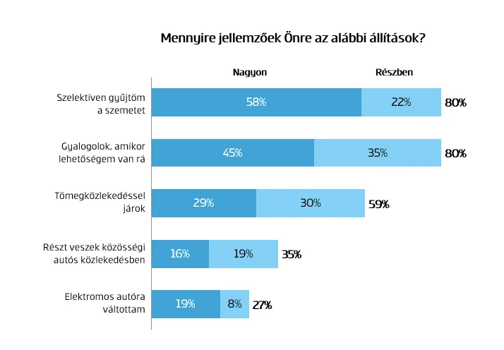 Az ügyfelek számára az élet egyéb területein is fontosak a környezeti szempontok. A szelektív hulladékgyűjtést például 86 százalék tartja elengedhetetlennek, 58 százalékra pedig nagyon, további 22 százalékra részben jellemző is, hogy így gyűjti a szemetet. A közlekedés során is mind nagyobb szerepe jut a környezetbarát megoldásoknak: csaknem 80 százalék nyilatkozott úgy, hogy gyalogol, ha erre lehetősége van, tömegközlekedést közel 60 százalék vesz igénybe. A válaszadók közül az elektromos autókat is nagy arányban használják (27 százalék) és a közösségi autós közlekedést is sokuk, 35 százalék, veszi igénybe több-kevesebb rendszerességgel.