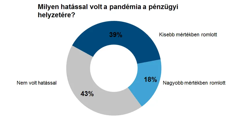 A magyar háztartások közel 60 százalékának rontotta a pénzügyi helyzetét a koronavírus-járvány. A válaszadók 39 százaléka mondta, hogy kisebb, míg 18 százaléka azt, hogy nagyobb mértékben szenvedte meg anyagilag a pandémiát. A járvány a pénzügyi megtakarítások szerepét is felértékelte: míg 2019-ben 70 százalék tartotta szükségesnek, hogy félretegyen, 2020-ban ez az arány 80 százalék, 2021-ben pedig 79 százalék volt – derül ki az IMAS International az Erste Csoport számára végzett felméréséből. A válaszadók 18 százaléka mondta azt, hogy többet tesz most félre, mint a pandémia előtt. A legtöbben, 28 százalék azért spórol többet, mert van, vagy újra van munkája (vagyis a munkahely elvesztésétől való félelem motiválja), míg 27 százalék nem tudott vagy nem akart nagyobb vásárlásokra, befektetésekre költeni az elmúlt időszakban (például lakást vagy autót venni). A válaszadók 24 százaléka számolt be arról, hogy nőttek a bevételei az elmúlt időszakban, és ugyancsak 24 százalék nyilatkozott úgy, hogy egyszerűen kevesebbet tudott költeni a járvány illetve a lezárások miatt.