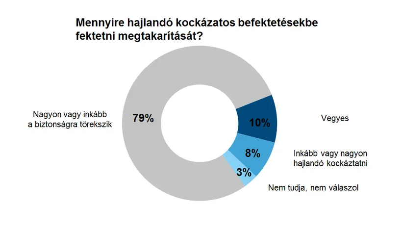 Magyarországon a megtakarítással rendelkezők elsősorban a hagyományos termékekben (takarékkönyvek, kártyák és számlák), illetve valamilyen biztosításban tesznek félre (22-22 százalék, de sokan tartják a megtakarításukat készpénzben (20 százalék). A válaszadók 13 százaléka rendelkezik ingatlanbefektetéssel, 12 százaléknak van nyugdíjpénztári megtakarítása, és mindössze 9 százalék mondta azt, hogy legalább részben értékpapírban fialtatja spórolt pénzét. Utóbbi összefüggésben lehet azzal, hogy a hazai megtakarítók mindössze 8 százaléka hajlandó csak nagyobb kockázatot vállalni a nagyobb hozamért, míg 79 százalék inkább a biztonságra törekszik. A részvénybefektetésekkel szembeni idegenkedés nőtt valamelyest az elmúlt évben, a válaszadók 18 százaléka volt teljesen elutasító, szemben a 2020-ban mért 15 százalékkal. Ugyanakkor a pozitív attitűd is javult: míg egy évvel korábban 24 százalék gondolta úgy, hogy az értékpapírok neki valók, ma már 28 százalék vélekedik így.