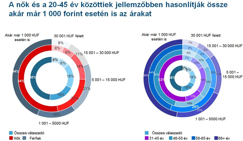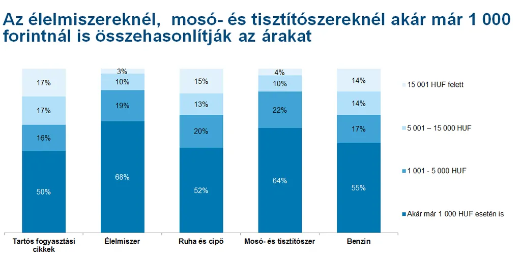 A vevők az árak tekintetében is körültekintően járnak el, a válaszadók fele akár már 1000 forint esetén is összehasonlítja a termékek árát. A nők gondosabban kezelik a családi kasszát, esetükben ez az arány 54 százalék, míg a férfiaknál a válaszadók 44 százaléka mondta azt, hogy akár már 1000 forintos kiadásnál is összeveti egymással a különböző termékeket. Ami az egyes korosztályokat illeti, a fiatal felnőttek (20-30 év közöttiek), és a fiatalabb középkorúak (31-44 év közöttiek) szentelnek nagyobb arányban figyelmet a kisebb tételeknek is, 60, illetve 53 százalék nyilatkozott így. A termékek esetében az élelmiszereknél, valamint a mosó- és tisztítószereknél számít minden forint: előbbinél a válaszadók 68, utóbbinál 64 százalék hasonlítja össze az árakat akár már egy 1000 forintos tételnél is.