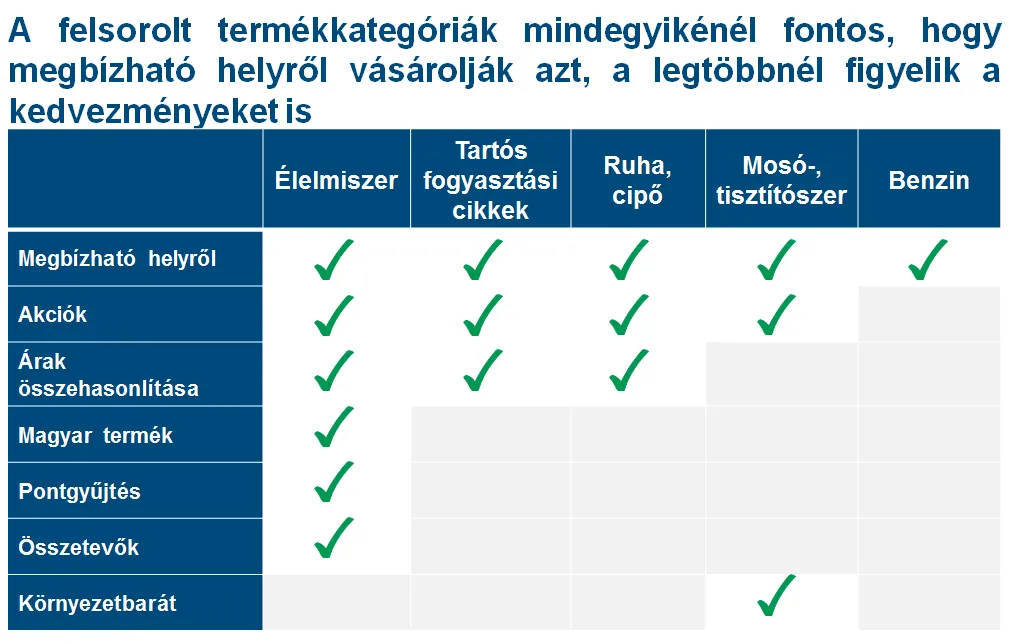 Az élelmiszereknél a származási ország mellett különösen fontosak az akciók, a különféle pontgyűjtő lehetőségek szerepe, valamint az, hogy az adott termék megbízható forrásból származzon. A válaszadók 72 százaléka mondta azt, hogy figyeli az élelmiszerekhez kapcsolódó akciókat, míg kétharmaduk részt vesz valamilyen pontgyűjtő programban is. A spórolásnál is fontosabb, hogy az adott élelmiszer megbízható helyről származzon. A vásárlók 85 százaléka erre különösen odafigyel.