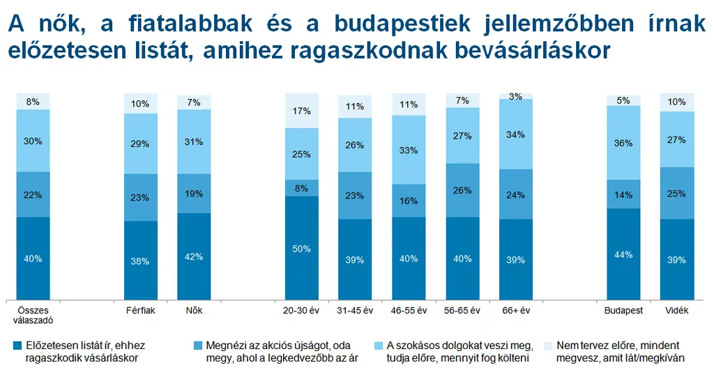 Odafigyelnek a pénzükre a magyarok, körültekintően intézik a bevásárlásokat, megnézik, hogy mit és mennyiért vesznek, keresik a kedvező, akciós ajánlatokat – derül ki az Erste Bank ügyfelei körében végzett felméréséből. A legtöbben (40 százalék) bevásárlás előtt listát írnak, amihez ragaszkodnak is, vagy a szokásos dolgokat veszik (30 százalék), így körülbelül tudják, mennyit fognak költeni. A nőkre, a fiatalabbakra és a budapestiekre jellemzőbb, hogy előzetesen összeírt listával vásárolnak, melyhez tartják is magukat. A férfiak inkább az akciós, kedvezőbb árú termékeket keresik, az idősebb korosztály jellemzően a megszokott dolgokat veszi, a vidéken élők pedig szívesen tájékozódnak az akciós újságokból.
