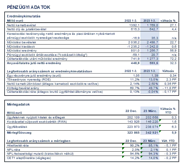 Az Erste Csoport (Erste Group Bank AG) 1,26 milliárd eurós működési eredményről számolt be 2023 első három hónapjában. Ez az éves összevetésben közel 57 százalékos növekedés tükrözi a szilárd, 1,77 milliárd eurós nettó kamatbevételt (27,1 százalékos növekedés az előző év azonos időszakához képest), amelynek hátterében a kedvező kamatváltozások és a hitelállomány növekedése áll. A pénzforgalmi szolgáltatások és a vagyonkezelés területén elért bevételnövekedés a nettó díj- és jutalékbevételeket 4,4 százalékkal növelték éves szinten, 643 millió euróra. Az átértékelési hatások következtében a nettó kereskedési eredmény 117 millió euróra javult, szemben az egy évvel korábbi 257 millió eurós veszteséggel. A működési költségek az előző év azonos időszakához képest 0,6 százalékkal, 1,24 milliárd euróra emelkedtek. Az első negyedévben a kockázati céltartalékok nettó feloldása 20,7 millió eurós pozitív értékvesztést eredményezett, amely hozzájárult az első negyedév 594 millió eurós nettó eredményének kialakulásához.