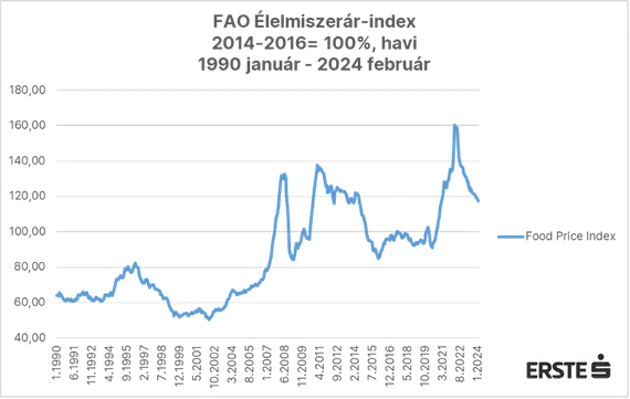 A globális élelmiszerárak is tovább emelkednek idén. Az ENSZ Élelmezésügyi és Mezőgazdasági Szervezete (FAO) adatai szerint az árak több mint negyven hónapja nőnek, a drágulás mértéke azonban már két éve lassul és idén tovább csökken. A FAO élelmiszer-árindexe (FFPI) februárban 117,3 ponton állt, amely 0,9 ponttal alacsonyabb a januári szinthez képest, és 13,8 ponttal marad el az egy évvel korábbi azonos időszaktól. Az Erste előrejelzése szerint az FFPI értéke lassuló ütemben ugyan, de tovább csökken idén, vagyis a drágulás mértéke alacsonyabb lesz, és őszre visszaállhat a referencia-időszakot jelentő 2014-2016-os évek átlagára.