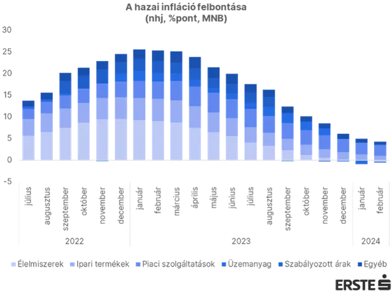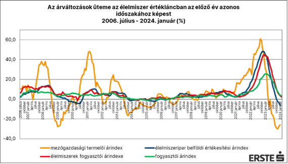Az infláció szempontjából kedvező a globális élelmiszeráraknál bekövetkezett fordulat, és ahogyan azt a FAO idősoros adatai mutatják, már egy ideje csökken a globális élelmiszerinfláció mértéke. Ennek fényében úgy tűnik, Magyarországon elsősorban a fogyasztói kereslet erőssége vagy gyengesége fogja meghatározni, hogy milyen mértékű átárazásokat képesek érvényesíteni a szektor szereplői a közeljövőben. Ugyanakkor folyamatos felfelé mutató árkockázatokat generálnak a kiskereskedelmi cégeket sújtó különadók és szabályozói terhek, így a fogyasztás várt élénkülése könnyen ismét magasabb inflációs nyomáshoz vezethet ebben a szektorban. Mindent összevetve az élelmiszerárak alakulása 2024-ben, az előző két évvel ellentétben, nem felfelé, hanem lefelé húzhatja az inflációt, amely idén az Erste előrejelzése szerint 4,7 százalék lehet – tette hozzá Nagy János.