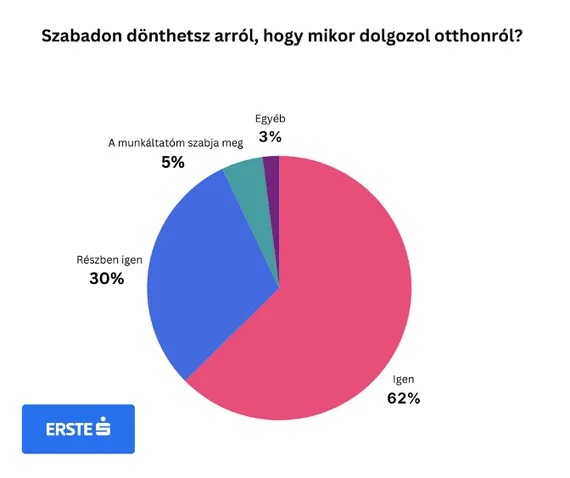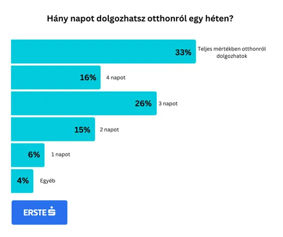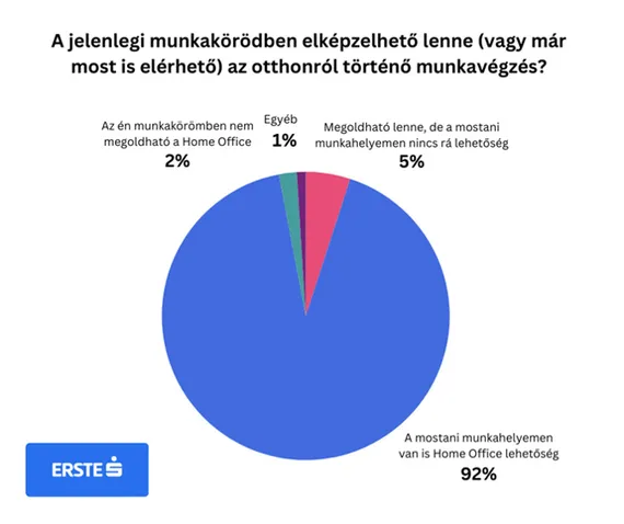 Az Erste rendszeresen kikéri munkatársai véleményét az otthoni munkavégzéssel kapcsolatban, ezúttal viszont arra volt kíváncsi, hogyan vélekednek a kérdésről más cégek dolgozói. A felmérésből kiderült, hogy a többség számára a koronavírus-járvány idején megtapasztalt home office mára a szükségből lehetőséggé vált: sokan szeretnek – legalább részben – otthonról dolgozni, és nagyon sok munkahelyen van is erre lehetőség. A bank által megosztott kérdőívet kitöltő dolgozók 92 százaléka nyilatkozott úgy, hogy a mostani munkahelyén lehet otthonról is dolgozni, és további 5 százalék válaszolta, hogy szerinte megoldható lenne a home office a munkakörében, de a munkáltatója nem engedélyezi azt.