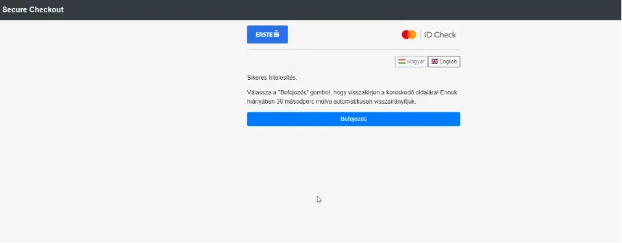 A hitelesítési folyamat lezárásához használd a Befejezés gombot. Ha ezt nem teszed meg, 30 másodperc múlva automatikusan visszairányít a kereskedő oldalára.