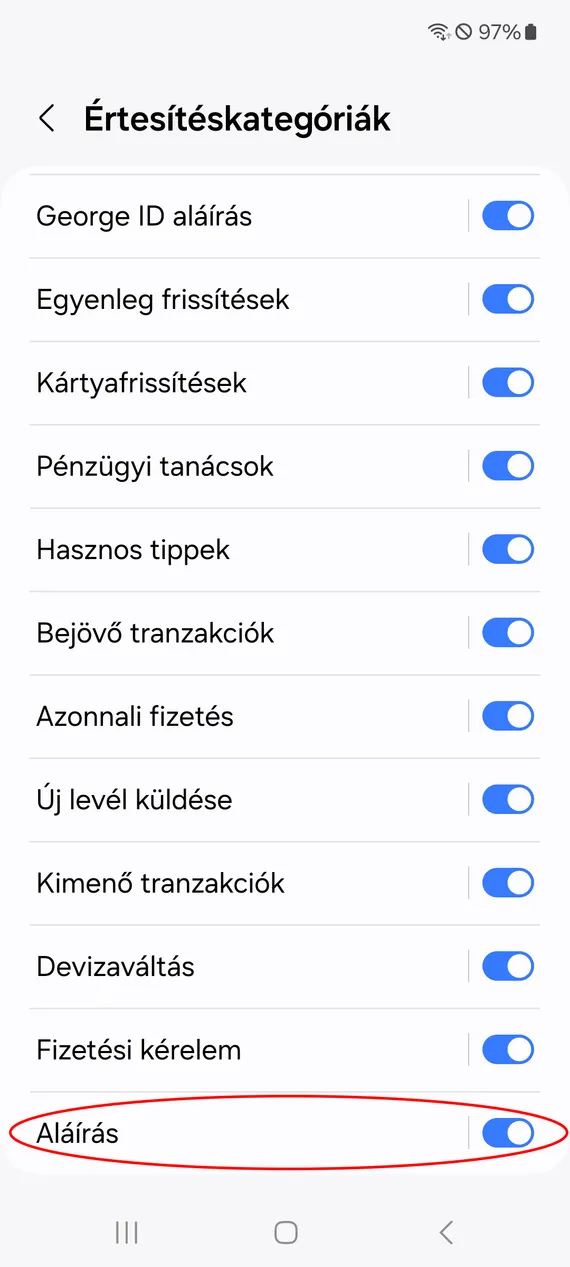Ellenőrizd az alkalmazásban a Profil / Értesítések és Őrszem menüpont / Alkalmazás beállításai alatt, hogy az Aláírás funkció be van-e kapcsolva! Nézd meg a lenti Huawei és Samsung példán, hogy jók-e a beállításaid!
